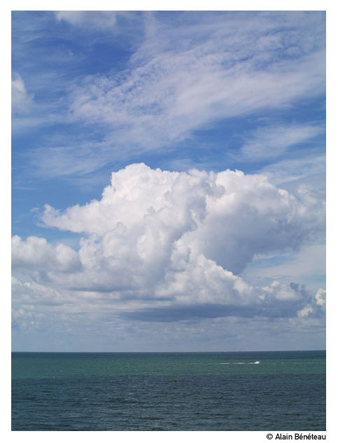 Je suis toujours surpris par la pureté de l'atmosphère au bord de la mer. Tout y est teinté différemment, la lumière ne subit pas le filtre polluant des villes. Ces jolies manifestations nuageuses verticales sont mes préférées par leur diversité de formes et de transparences. Levez les yeux au ciel, et vous verrez.