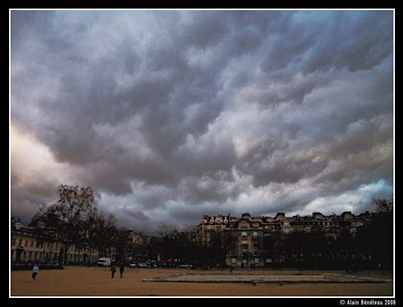 Il suffit de porter l'appareil photo en bandoulière et de traîner du côté de la tour Eiffel pour s'intégrer parfaitement à la masse touristique. On vous accoste pour vous vendre des breloques horribles, des gens ou des couples vous demandent de les photographier devant la tour (même si vous leur expliquez que là, ils vont être en contre-jour...). Certains me jettent des regards intrigués car je photographie tout sauf les monuments. Ils ne voient pas les nuages, leur mouvements éphémères, leur apport à la composition d'une photo. Ils isolent le sujet de son état atmosphérique. Mais finalement, c'est peut-être moi qui m'égare. Voici quelques clichés de ce Samedi 17 mai.
