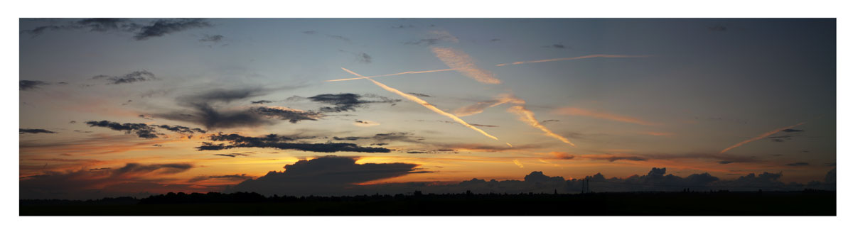 Pour finir cette journée remarquable du point de vue météo, un panorama de la campagne près de Rennemoulin dans les Yvelines au couchant. Une petite cellule peu active et sa traîne de congestus dans un joli ciel enflammé.